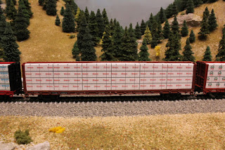 Anyway, I promised more pictures of lumber loads, so I shot a few tonight. I have a total of twelve different brands of wrappers and have plans for several more. What am I going to do with all of these lumber loads? Well, I plan to use a few for myself, and I started offering some for bid on ebay. From what started out as a hunt for a nice lumber load for a couple of my centerbeam flatcars has quickly spiraled out of control. Isn't that how most addictions work?
