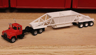 The Trail King bottom dump trailer is almost finished. I need to apply DOT stripes to each side and add mudflaps. I will try to share my DOT stripe technique in a future post, however, in a nutshell: I use MS Excel to create a grid or line of red/white/red/white dashes, print them on regular paper, use a hobby knife to cut a very fine strip of paper, spray the backside with adhesive, and stick it to the model. That is how I did the grain trailer. On that model, don't forget to add yellow marker lights, 5 on each side.